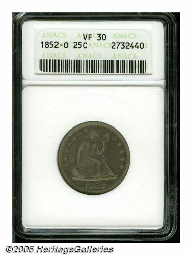 <B>1852-O<25C> VF30 ANACS.</B></I> The faintly granular surfaces are sharply detailed, for the grade, with light toning and a smooth, unabraded appearance. One of the rarest of the early O-mint quarters.<BR><I>From The Empire State Collection, Part Two.</B></I>