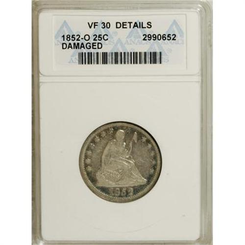 <B>1852-O 25C --Damaged--ANACS. VF30 Details.</B></I> NGC Census: (1/12). PCGS Population (2/14). Mintage: 96,000. Numismedia Wsl. Price for NGC/PCGS coin in VF30: $875. (#5420)<BR><BR><B>Coin Engraver:</B> Christian Gobrecht<BR><BR><b>Shipping:</b> Coins & Currency (<a target="_blank" href="http://www.heritageauctions.com/common/shipping.php">view shipping information</a>\)