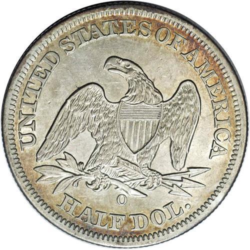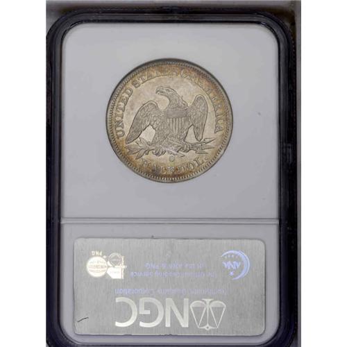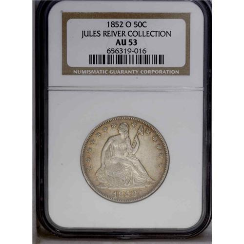 <B>1852-O<50C> AU53 NGC.</B></I> Rich peach-gold toning outlines the rims and encroaches upon the lightly patinated centers. This pleasing Seated Half briefly entered Southern commerce prior to the Civil War, but has since been carefully saved. No singular marks require mention, and the eye appeal and originality are unmistakable. The 1852-O was limited to 144,000 pieces. Silver coins did not circulate in 1852, since an influx of west coast gold had increased the relative value of silver, and removed the latter metal from commerce. Population: 4 in 53, 13 finer (9/05).