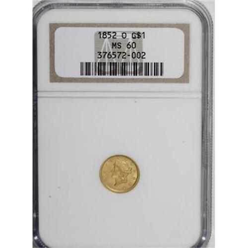 <B>1852-O G$1 MS60 NGC.</B></I> NGC Census: (12/130). PCGS Population (1/52). Mintage: 140,000. Numismedia Wsl. Price for NGC/PCGS coin in MS60: $1,125. (#7520)<BR><BR><B>Coin Engraver:</B> James B. Longacre<BR><BR><b>Shipping:</b> Coins & Currency (<a target="_blank" href="http://www.heritageauctions.com/common/shipping.php">view shipping information</a>\)