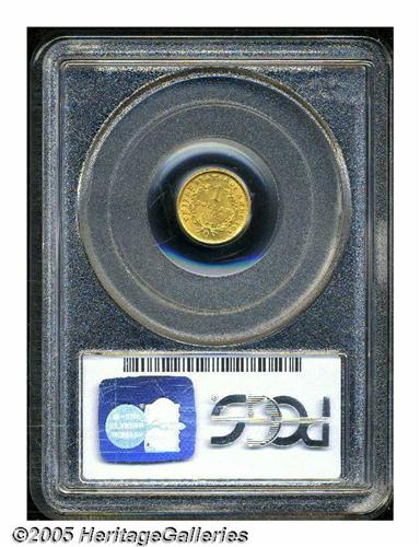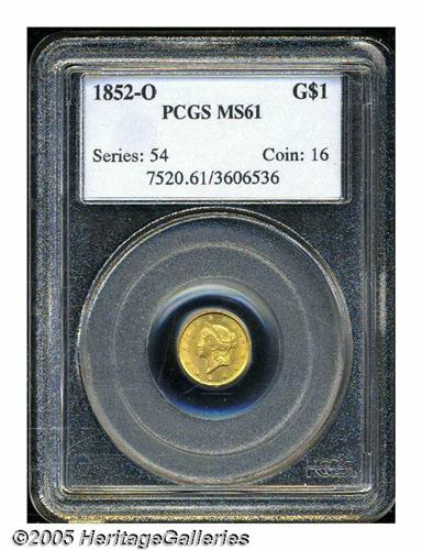 <B>1852-O<G$1> MS61 PCGS.</B></I> The 52-O is generally offered with a softer strike than that which characterizes most earlier O-mint issues in the Type One Gold Dollar series. This example possesses a better than average strike, with all of the design elements displaying relatively sharp definition. The surfaces are a greenish-gold, exhibit soft luster, and show a few minute obverse contact marks. A couple of short pinscratches are located in the upper reverse field. This issue is scarce in Mint State.