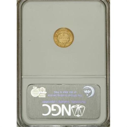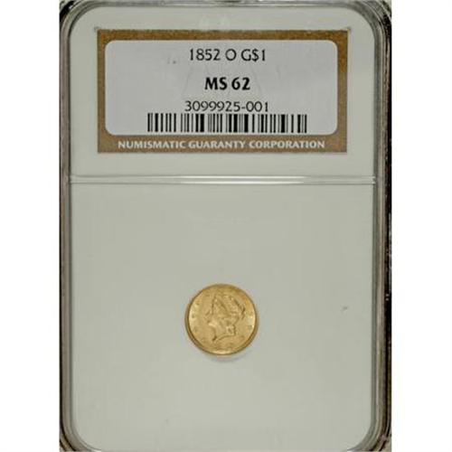 <B>1852-O G$1 MS62 NGC.</B></I> Highly lustrous with satiny, honey-gold surfaces and few marks on either side. This issue is second only to the very scarce 1850-O among Type One gold dollars. Census: 42 in 62, 34 finer (3/08). <BR><BR><B>Coin Engraver:</B> James B. Longacre<BR><BR><b>Shipping:</b> Coins & Currency (<a target="_blank" href="http://www.heritageauctions.com/common/shipping.php">view shipping information</a>)