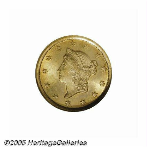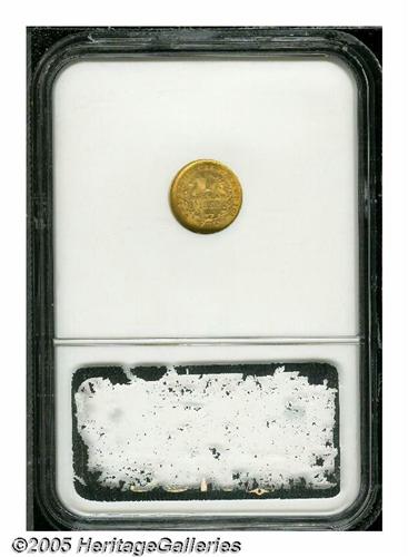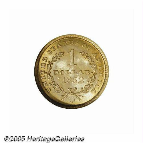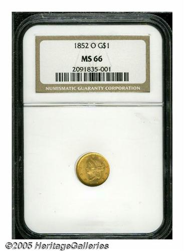 <B>1852-O<G$1> MS66 NGC.</B></I> The 1852-O is a scarcer O-mint Type One gold dollar. Several dozen Uncirculated coins are known today, thus the '52-O is not conditionally rare in MS60 or better grades. However, in MS66 condition, this piece is tied with one other as finest known--both of which are NGC coins (6/05). This is an exceptionally lustrous coin that has mint frost that more closely resembles an S-mint gold coin than an O-mint piece. Evidence of heavy metal flow is seen around the margins, indicating this coin was struck from a later state of the dies. The surfaces exhibit rich reddish patina that deepens more around the peripheries, and there are no distracting blemishes on either side of this exceptional coin.