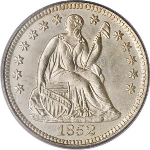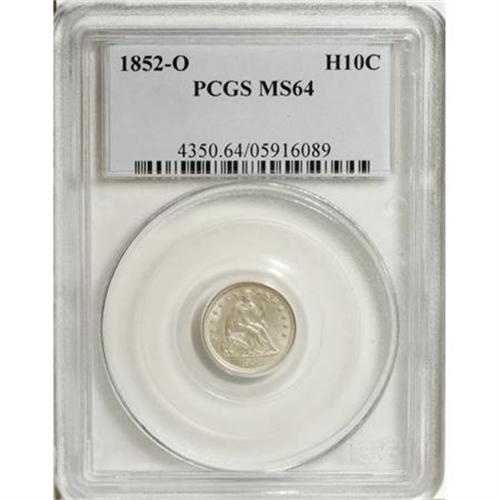 <B>1852-O H10C MS64 PCGS.</B></I> The 1852-O has a deceptively high mintage of 260,000 pieces. It is deceptively high because the majority struck were melted in 1852 and early 1853 as they were worth more melted than their face value. That situation was remedied in February 1853, but for silver coins produced in the early 1850s widespread melting renders mintages largely irrelevant. Scarce in all grades, and especially challenging in mint condition, only 13 other pieces have been so graded by PCGS and NGC combined with 11 finer (8/07). The satiny surfaces of this coin are brilliant throughout and the striking details are fully detailed on each side. Light die clash marks are the only mentionable "flaws" on the obverse or reverse.<BR><BR><B>Coin Engraver:</B> Christian Gobrecht<BR><BR><b>Shipping:</b> Coins & Currency (<a target="_blank" href="http://www.heritageauctions.com/common/shipping.php">view shipping information</a>)