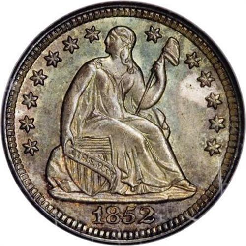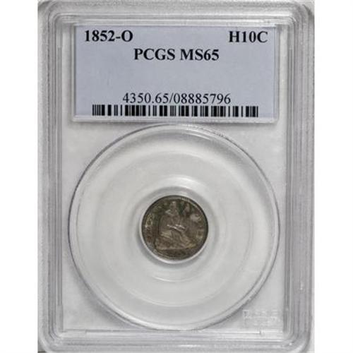 <B>1852-O H10C MS65 PCGS.</B></I> V-1. This was a heavily melted issue that has astonishingly few survivors, considering its original mintage of 260,000 pieces. This Gem example is satiny and well struck, with an attractive coating of olive-green over both sides that is occasionally interrupted by untoned spots. Just three pieces have received the MS65 assessment from PCGS, with only one finer (7/07). <BR><BR><B>Coin Engraver:</B> Christian Gobrecht<BR><BR><b>Shipping:</b> Coins & Currency (<a target="_blank" href="http://www.heritageauctions.com/common/shipping.php">view shipping information</a>\)