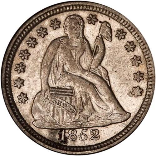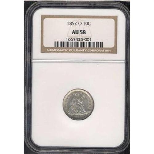 <b>1852-O Liberty Seated Dime. NGC graded AU58.</b> A lustrous, well preserved specimen with low mintage of just 260,000 pieces, many of which the government melted in 1853-55. Not at all common or widely available in this grade <b>(PCGS # 4598)</b>