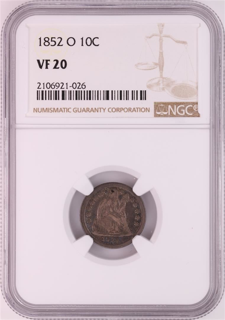 One 1852-O Seated Liberty Dime Coin NGC VF20. NGC Certified.