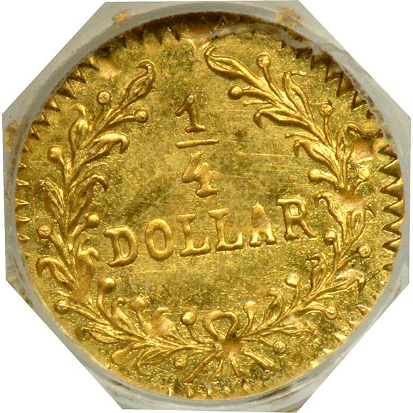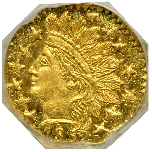 "1852" Quarter Dollar Octagonal Indian. BG-799U High Rarity 5. NGC graded MS-66. Blazing gem! Desirable and very rare backdated Second Period quarter with the date 18 52 (widest space between second and third characters). In BG-799U, the hair joins 52, while 1 extends well into the bust. Uses reverse C as on others. "All seen have plain 'ghosts' of stars" according to Breen-Gillio. Pop 1; the finest of only 3 examples graded at NGC.