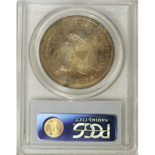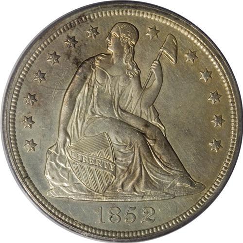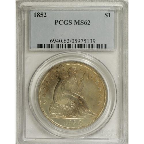 <B>1852 S$1 MS62 PCGS.</B></I> During the year, the Philadelphia Mint coined just 1,100 circulation strike dollars along with a small additional quantity of proofs, perhaps numbering 15 to 30 coins. An additional number of proofs were restruck in later years, perhaps numbering nearly 100 additional coins. It is believed that all circulation strike coins were originals actually issued in 1852, and such pieces are deemed the most important by knowledgeable collectors and numismatists. Most surviving circulation strike coins are seen in grades of XF and AU, although occasionally lower or higher grade pieces appear in the marketplace. This example is one of those higher grade Mint State pieces, and it is highly desirable at this grade. The surfaces are satiny and mildly prooflike, with somewhat reflective devices. Pale champagne color covers both sides with splashes of deeper lilac toning.<BR> Certain important die characteristics can be seen on the piece, distinguishing it from proofs, either original or restrikes. The obverse fields have faint die striae or polishing lines parallel to Liberty's left shin. Liberty has a "beard" with the space between her chin and shoulder unfinished. Fine diagonal file lines are close to the obverse dentils at about 5 o'clock. The lowest crossbar on the reverse extends left of the shield border. At the bottom of the shield, several vertical elements extend well beyond the shield border. In fact, every one of the 18 individual vertical lines in the six shield stripes extend beyond the lower shield border to one degree or another. Similarly, nearly every vertical line extends into the horizontal crossbars, with the first line of stripe 3 extending upward through at least six crossbars.<BR> All of these various characteristics identify this piece as an 1852 "Original" silver dollar, in our opinion, and a coin that will receive great attention when it crosses the auction block. Population: 5 in 62, 6 finer (2/07).<BR><BR><b>Shipping:</b> Coins & Currency (<a target="_blank" href="http://www.heritageauctions.com/common/shipping.php">view shipping information</a>)