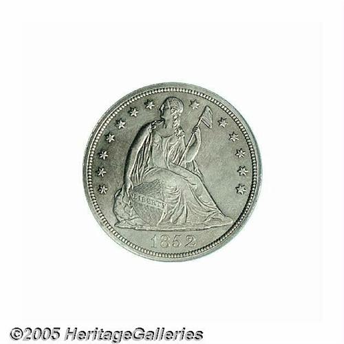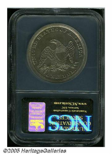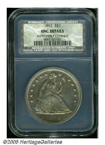 <B>1852<S$1> Unc Details, Improperly Cleaned, NCS.</B></I> Light steel gray and a bit washed out from a past cleaning on both the obverse and reverse. Moderate hairlines can be seen with a loupe, but this is still a decent coin for the collector who needs this very scarce date. This is an original striking and not one of the later proof only restrikes.<BR>The early 1850s were filled with change in America, the California Gold Rush was in full swing and a seemingly endless river of gold was flowing to the eastern banks from the hills and streams not far from San Francisco. Given this event, the price of gold fell relative to silver, so much so that the price of silver actually rose above the face value of United States coins then in circulation. This state of affairs brought about the melting of silver coins. Forced to act, Congress reduced the silver content of the half dime through half dollar, bringing the bullion value back below the melt value, and the mints coined millions of the new lighter weight pieces to keep commerce moving. The amount of silver in the silver dollar was left unchanged for traditions sake. Thus, few silver dollars saw any real circulation during the early 1850s, and very little silver was brought to the mints for coinage. The mintage for the 1852 silver dollar petered out after a paltry 1,100 slid down the coining chute. Certainly not many to go around, and finding any decent looking specimen can be a challenge for the date collector. The present coin is for the collector who can look past the minor imperfections and understand the rarity of this elusive issue.<BR><I>From The Dr. John L. Pellegrini Collection of Liberty Seated Dollars.</B></I>