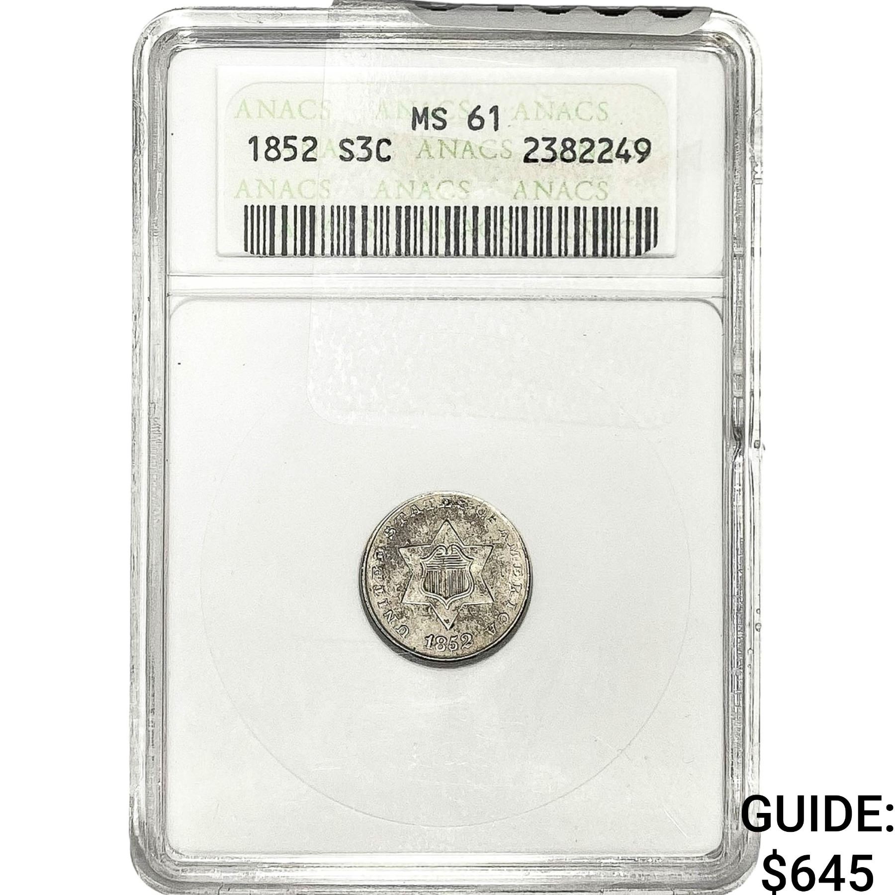 1852 Silver Three Cent ANACS MS61