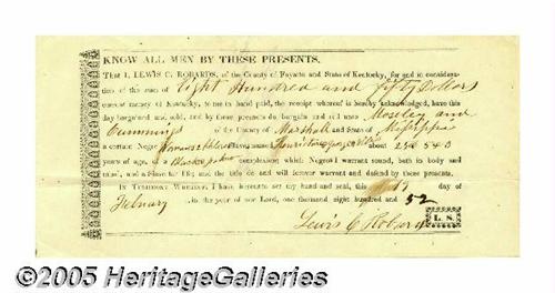 <B>1852 Slave Bill of Sale, L. C. Robards, Fayette, Kentucky</B></I> A sad reminder of our nation's tragic past where humans were bought and sold as commodities. Lewis C. Robards was a particularly disgusting slave merchant. Based in the Lexington, Kentucky area, he would advertise in the newspapers to buy slaves (if he didn't have someone steal them). He would then place these men, women and children into pens with iron bars to be transported on a steamboat to the deep South. Sometimes, he would chain them together and march them down the trails called the Natchez Trace. They were then sold to the highest bidder. If this wasn't bad enough, he was known to take the light-skinned, young and attractive females and sell them to brothels and syndicates in New Orleans as prostitutes. These were called "quadroons" and were his specialty. Offered here is a Bill of Sale dated February 19, 1852 where Robards sold a 25 year old woman and her two small children, ages five and three, to Messrs. Moseley and Cummings of Marshall County, Mississippi. The purchase price was $850. Very fine condition, approximately 8" x 3.75" in size. Worthy of further research. Lot:251