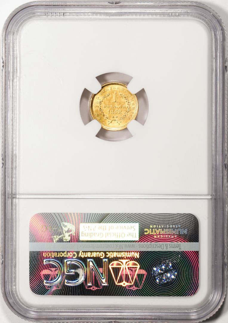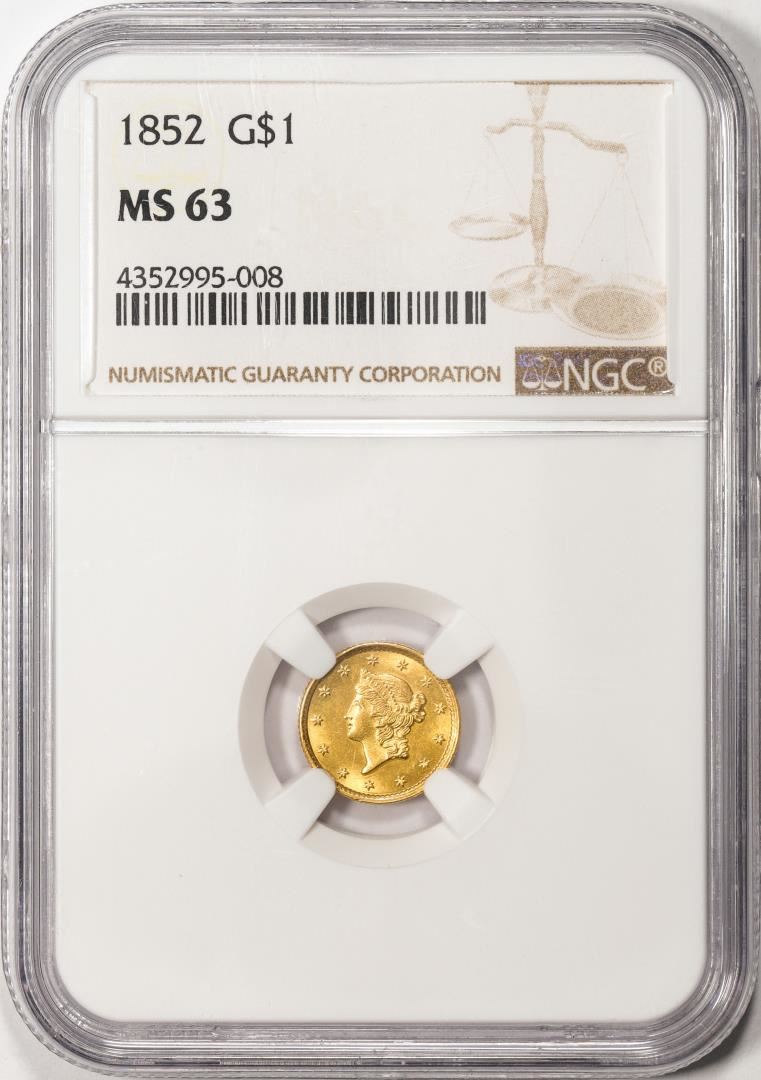 One 1852 Type 1 $1 Liberty Head Gold Dollar Coin NGC MS63. NGC Certified.