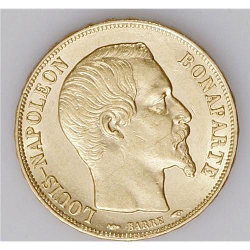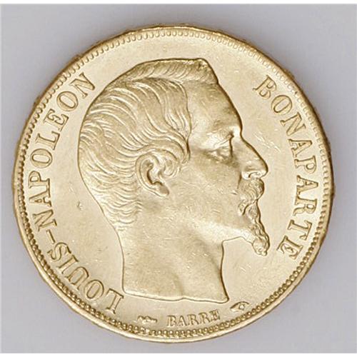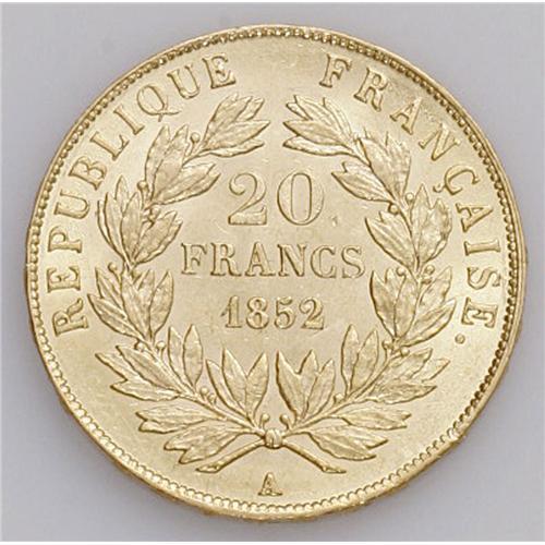 <B>Napoleon III 1852A gold 20 Francs pair as follows:</B></I> KM774, 1 AU and 1 XF-AU with small areas of dark incrustation.