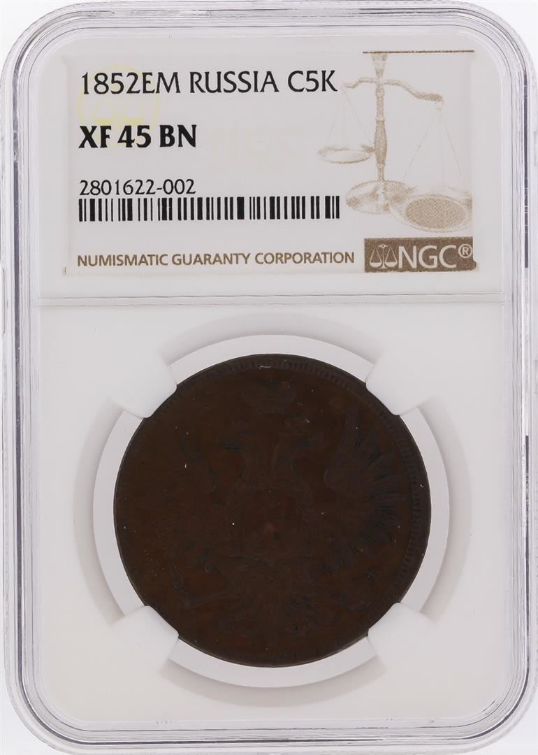One 1852EM Russia 5 Kopeks Copper Coin NGC Graded XF45 BN. NGC Certified.