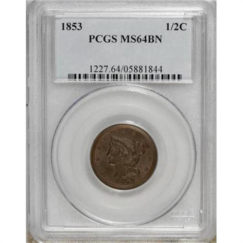 <B>1853 1/2 C MS64 Brown PCGS.</B></I> . PCGS Population (109/39). NGC Census: (161/137). Mintage: 129,694. Numismedia Wsl. Price for NGC/PCGS coin in MS64: $360. (#1227)<BR><BR><B>Coin Engraver:</B> Christian Gobrecht<BR><BR><b>Shipping:</b> Coins & Currency (<a target="_blank" href="http://www.heritageauctions.com/common/shipping.php">view shipping information</a>)