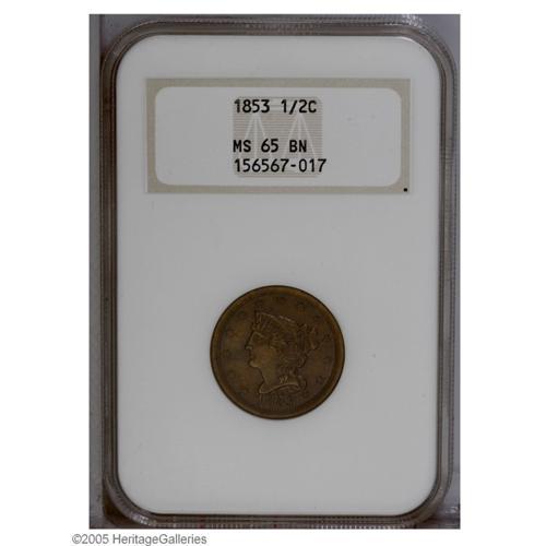 1853 1/2 C MS65 Brown NGC. B-1, C-1, R.1. A small die 1853[1/2 C] MS65 Brown NGC.