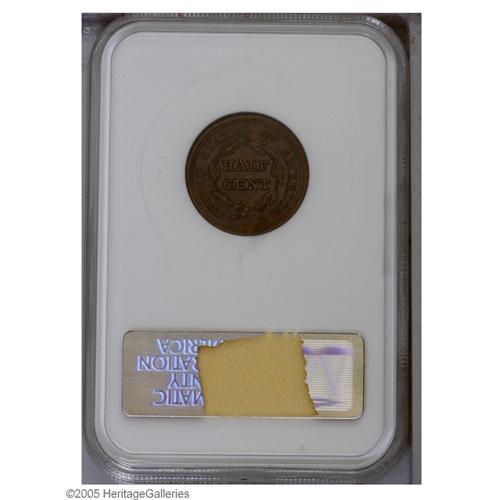 <B>1853<1/2 C> MS65 Brown NGC.</B></I> B-1, C-1, R.1. A small die lump near the cheekbone is characteristic of the issue. A sharply struck Gem with consistent mahogany-brown patina and a well preserved portrait. Well preserved aside from a small amount of encrustation around the devices on the reverse.