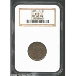 1853 1/2 C MS66 Brown NGC. B-1, C-1, R.1. A lovely, high grade example of this popular issue. Sharply defined both in the centers and at the margins, the reddish-brown surfaces show a high degree of glossiness and the coin is exceptionally attractive in all regards. Important notice: We expect to be auctioning lots at the rate of 200-250 per hour. Sometimes eBay Premier live bid software cannot keep up with that pace, so we strongly recommend that you place a realistic proxy bid now as insurance to avoid disappointment. Also please note that all Heritage/CAA lots purchased through eBay Premier carry a 20% Buyer's Premium. Please make sure you read the Terms and Conditions.