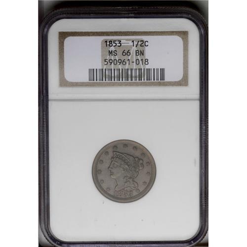 <B>1853<1/2 C> MS66 Brown NGC.</B></I> C-1, B-1, R.1. A penetratingly struck golden-brown beauty with refreshingly smooth surfaces and an occasional glimpse of original orange iridescence. EAC 60+. <BR><BR><B>Important notice:</B> Heritage usually auctions material at the rate of 200-250 lots per hour. On some occasions eBay Live bid software or the Internet may not be able to keep up with the pace of the auction. We recommend placing a realistic absentee bid now as insurance to avoid disappointment. Occasionally the auctioneer may eliminate or reject an eBay Live bid, and the auctioneer may also reopen a lot after the close of the eBay live bidding (usually because we missed an audience bid), and may reject your bid even if it shows you as the winning bidder. By bidding via eBay Live, you agree that Heritage may award the lot to another bidder at its sole discretion under the circumstances described above or any other reasonable circumstances. Since eBay bids are not shown to us until we open the lot on the floor, we treat those bids just like floor bids. In most cases the floor responds before the eBay bid is presented to us, due to Internet lag time, so for consistency we have made it a policy that floor bids are always considered first over tie eBay live bids. Also please note that all Heritage lots purchased through eBay Live carry a 20% Buyer's Premium. Please make sure you read the Terms and Conditions before you bid. This lot is being auctioned in conjunction with a live floor auction by Heritage Galleries & Auctioneers. All final auction and invoice information will be supplied by Heritage Galleries & Auctioneers, and all other information should be considered preliminary. Lot:227 <BR><BR><B>Winning Notification and Billing:</B> After the FINAL session in this auction is complete, Heritage will send e-mail and snail mail invoices. This process normally takes several days. All final auction and invoice information will be supplied by Heritage Galleries & Auctioneers, and all other information should be considered preliminary. <BR><BR>This auction will be conducted on a live auction floor and over the Internet through eBay Live. If you choose to place an absentee bid, please take a moment to <font color='#0000ff'><u><a href='http://pages.ebay.com/liveauctions/help/before/laabsentee.html'>learn how eBay Live absentee bidding works</a></u></font><font color='#000000'>