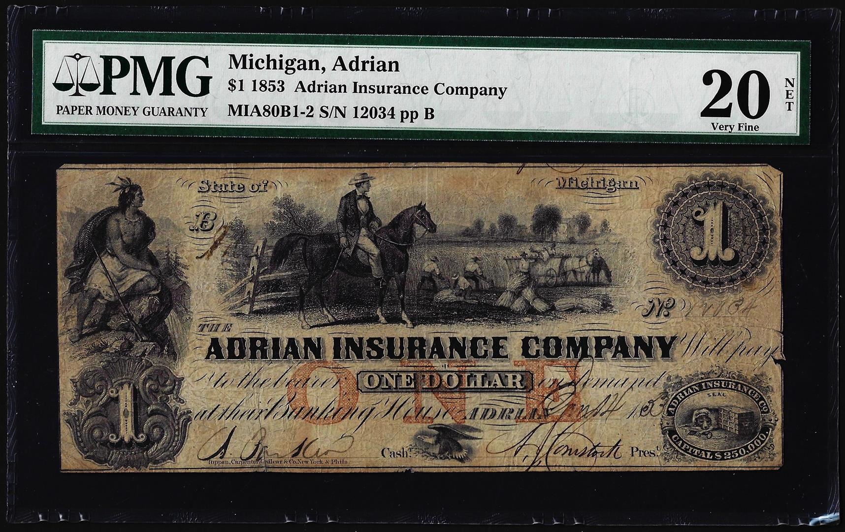 One 1853 $1 Adrian Insurance Company Michigan Obsolete Note PMG Very Fine 20 Net. PMG Certified.