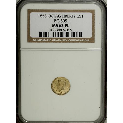 <B>1853 $1 Liberty Octagonal 1 Dollar, BG-505, R.4, MS63 Prooflike NGC.</B></I> Moderately reflective and well struck with brassy greenish-gold surfaces that have stray marks. This is the only Prooflike example certified by NGC (12/06).<BR><I>From The Twin Hollows Collection, Part Two.</B></I><BR><BR><b>Shipping:</b> Coins & Currency (<a target="_blank" href="http://www.heritageauctions.com/common/shipping.php">view shipping information</a>)