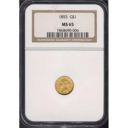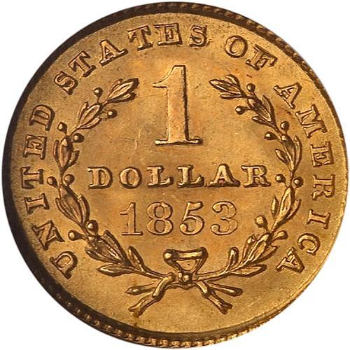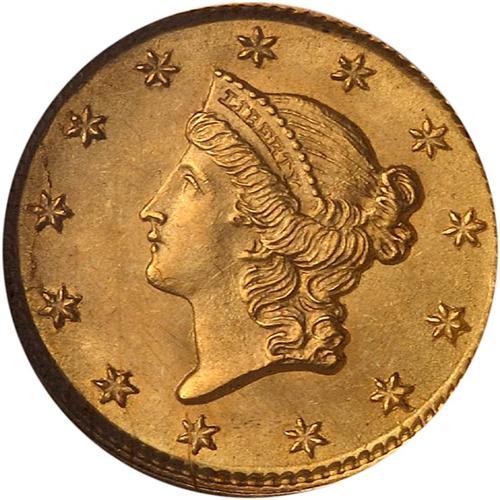 Well struck on bright original gold, the most common date of this type, with a small die crack at the two stars in front of the face. The reverse is the re cut DOLLARS variety. Perfect for a gem type coin. Bids at $4600 and trends at $5500.
