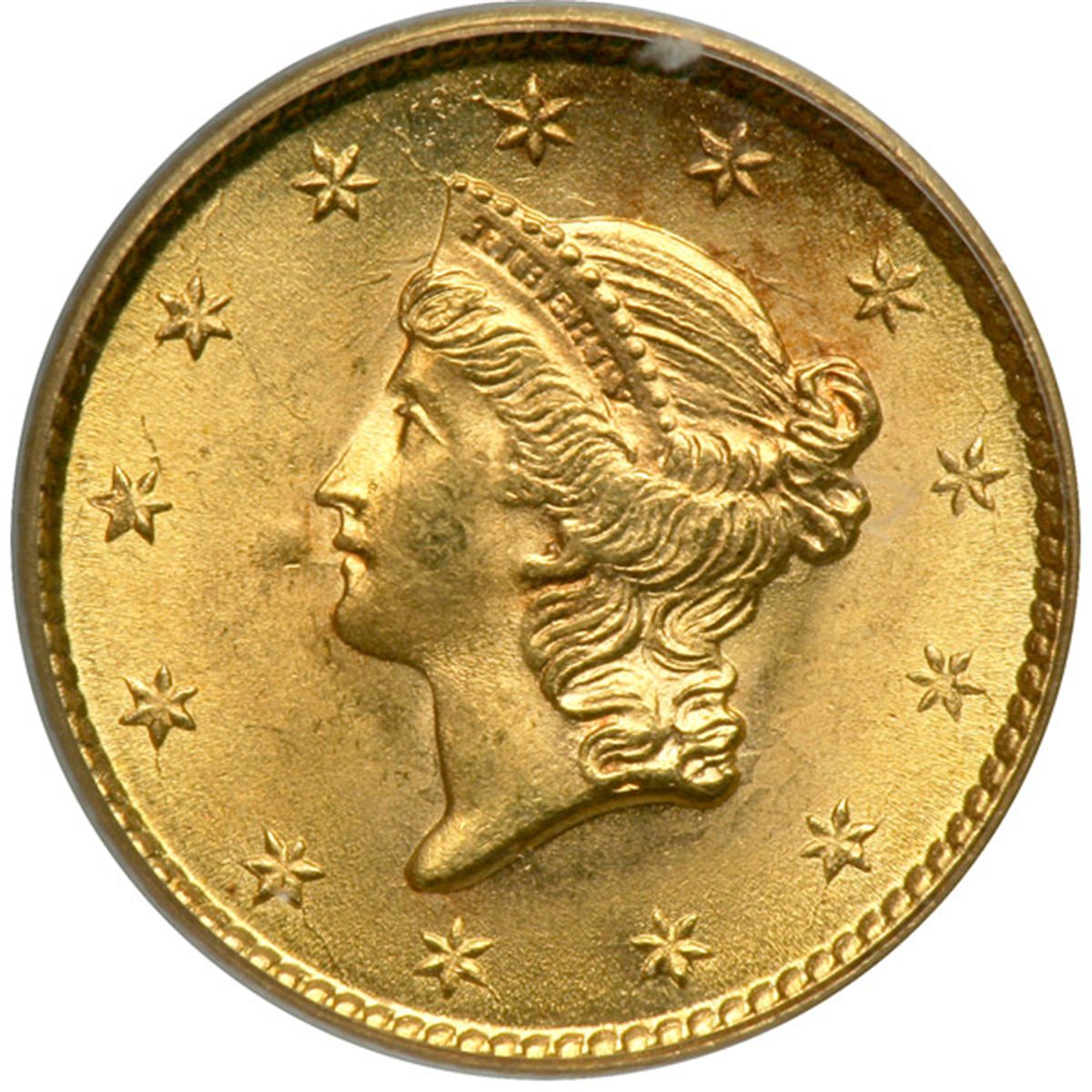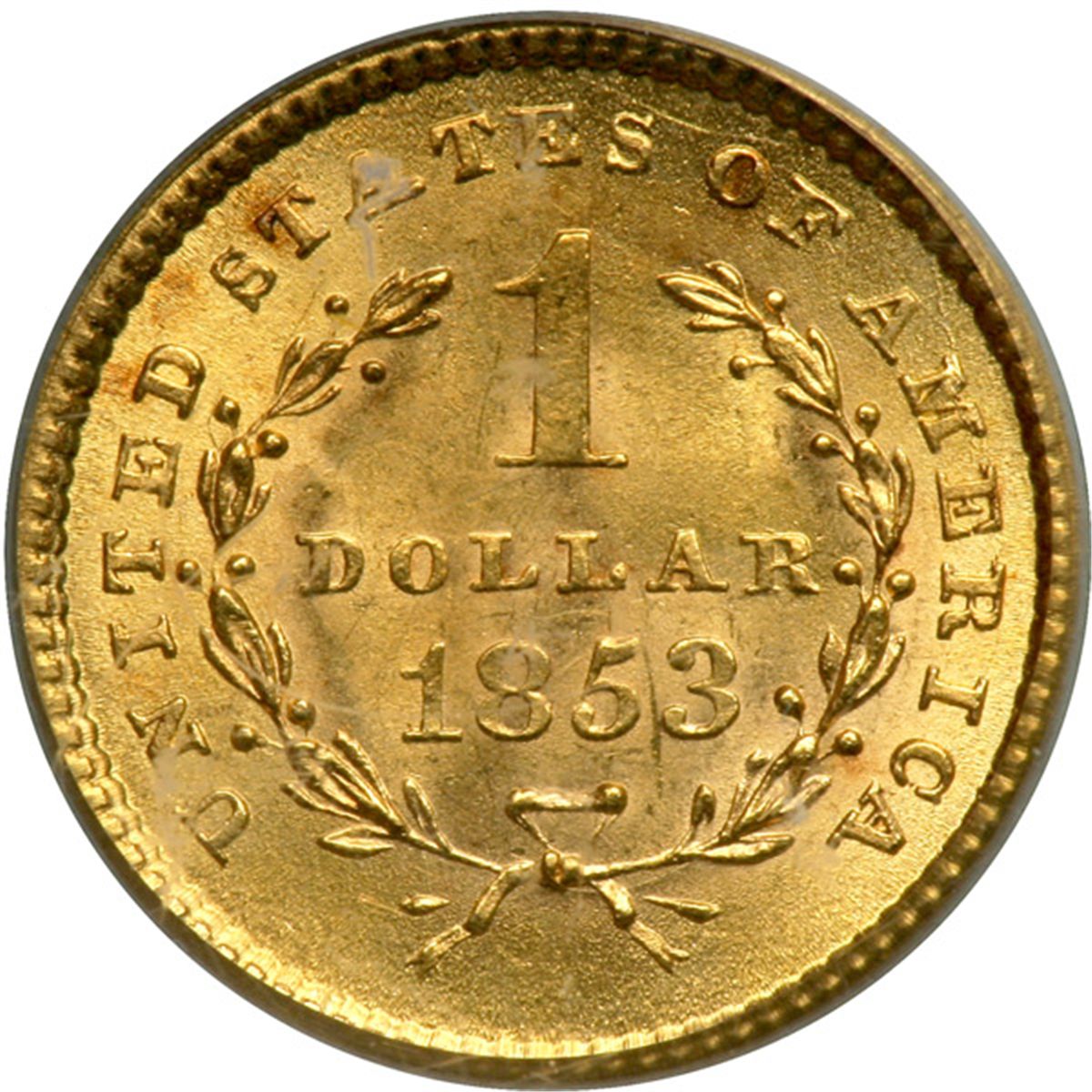 1853 $1 Gold Liberty. PCGS graded MS-63 PQ. CAC Approved. Well struck with a hint of gold tone. A coin that should be regraded higher (PCGS # 7521) .