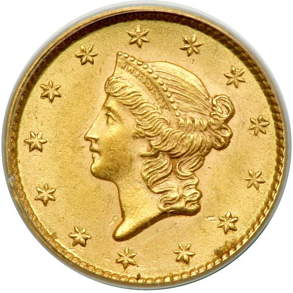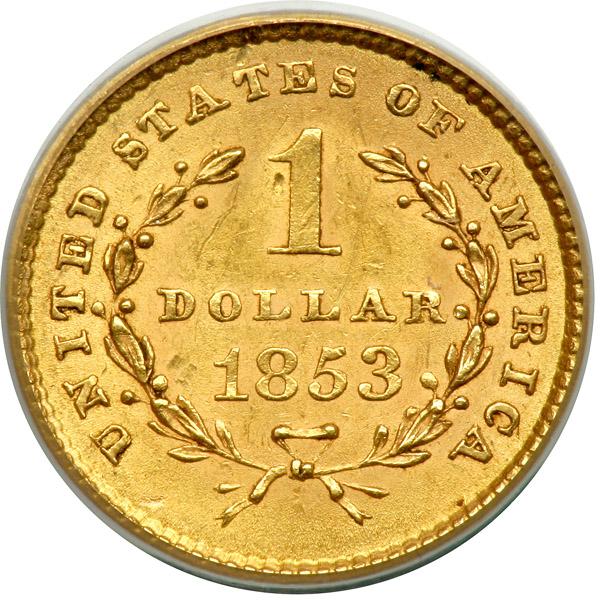 1853 $1 Gold Liberty. PCGS graded MS-63 PQ. CAC Approved. Uncommonly smooth with fully metallic, golden features with a small amount of toning on the obverse at 5 o'clock. Struck with methodical precision throughout (PCGS # 7521) .