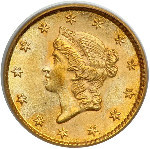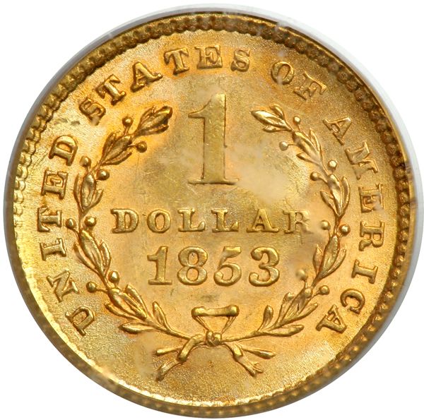 1853 $1 Gold Liberty. PCGS graded MS-64 PQ CAC Approved. Well struck with lovely golden toning. The color is a rich blend of orange-gold and honey-gold shades. Desirable with this controlled strike and dancing luster (PCGS # 7521) .
