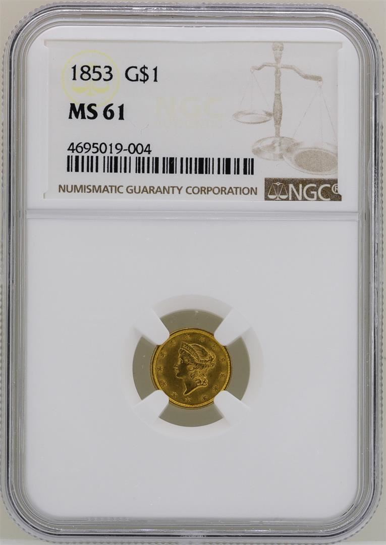 One 1853 $1 Liberty Head Gold Dollar Coin NGC MS61. NGC Certified.