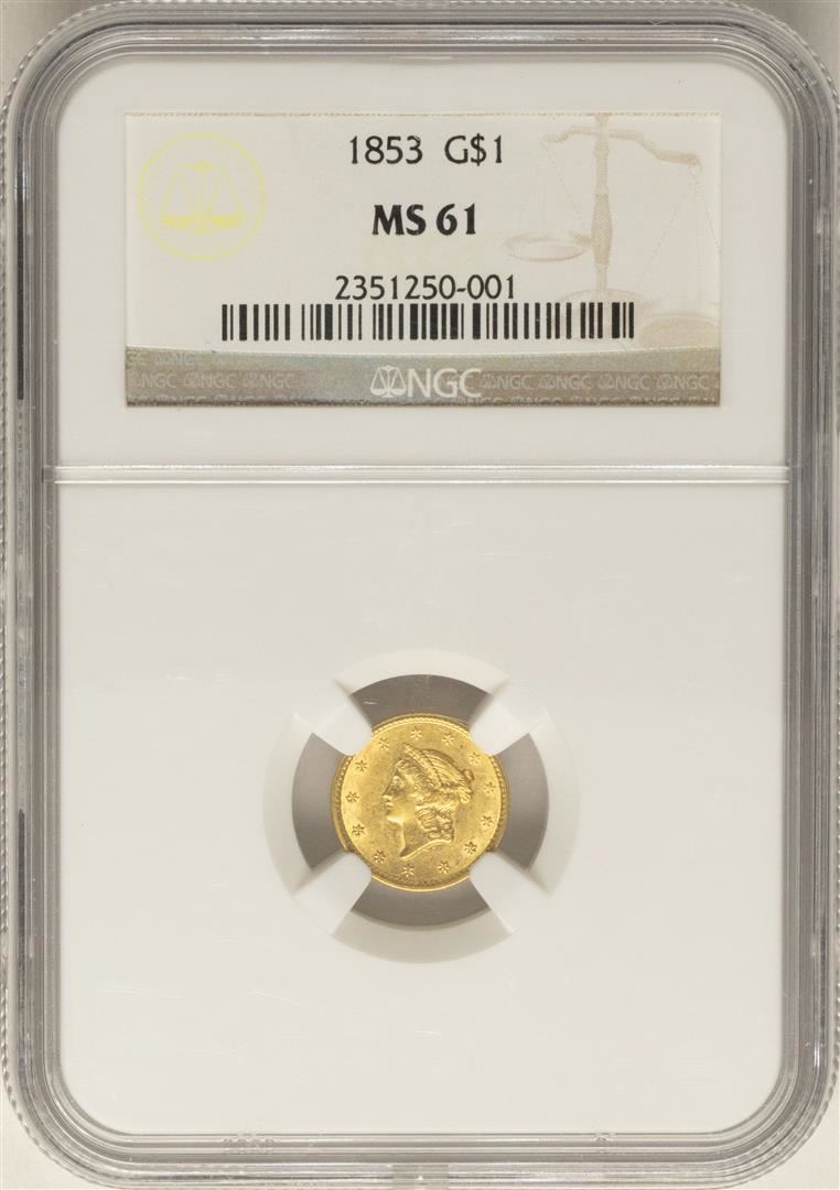 One 1853 $1 Liberty Head Gold Dollar Coin NGC MS61. NGC Certified.
