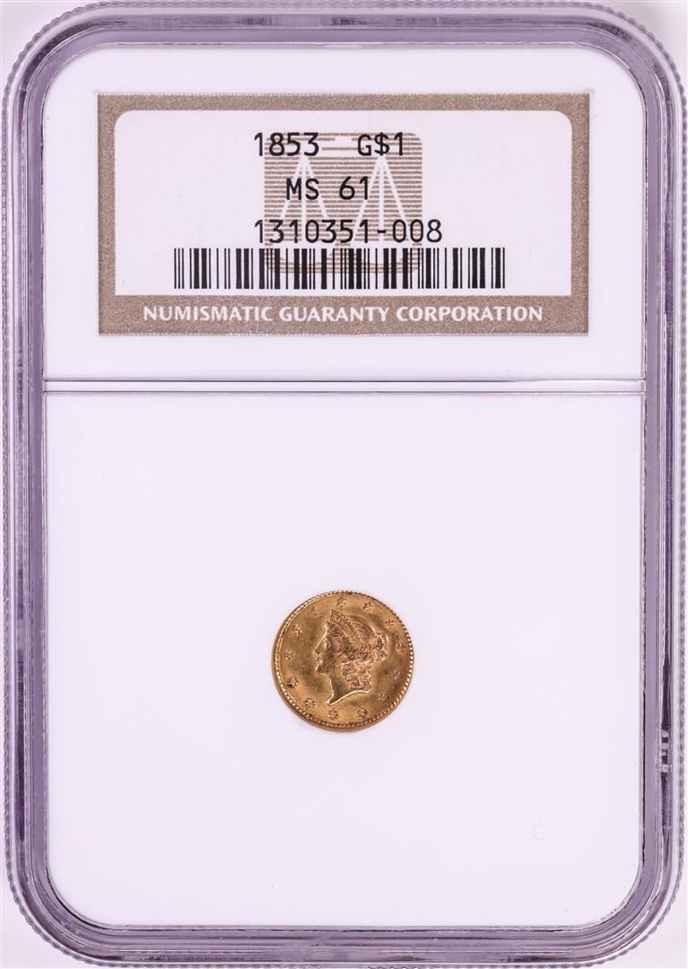 One 1853 $1 Liberty Head Gold Dollar Coin NGC MS61. NGC Certified.