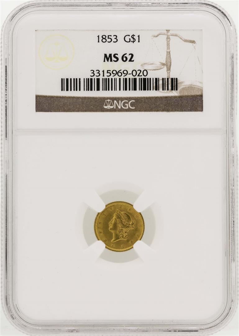One 1853 $1 Liberty Head Gold Dollar Coin NGC MS62. NGC Certified.