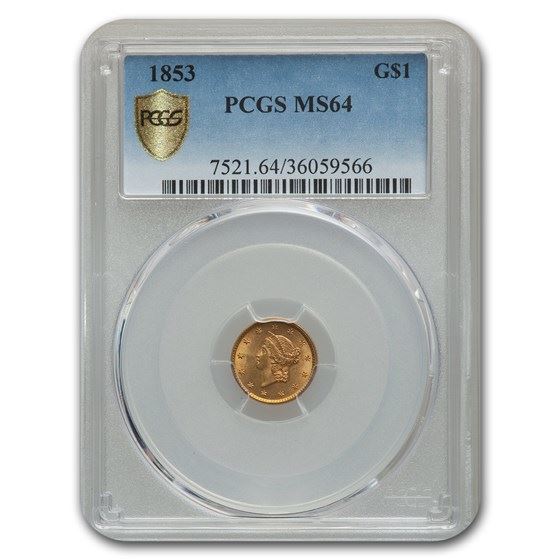 One piece 1853 $1 Liberty Head Gold MS-64 PCGS