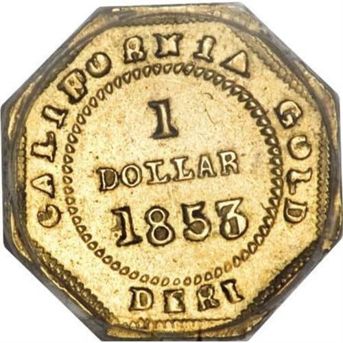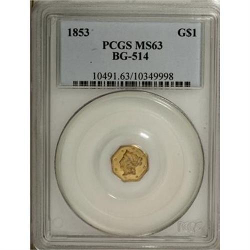 <B>1853 $1 Liberty Octagonal 1 Dollar, BG-514, High R.5, MS63 PCGS.</B></I> A well impressed representative whose smooth green-gold fields are slightly glossy and moderately prooflike. The DERI on the reverse exergue is short for the maker, Deriberpe. Population: 5 in 63, 4 finer (11/07).<BR><BR><b>Shipping:</b> Coins & Currency (<a target="_blank" href="http://www.heritageauctions.com/common/shipping.php">view shipping information</a>)
