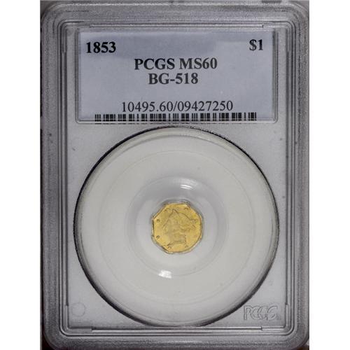 1853 $1 Liberty Octagonal 1 Dollar, BG-518, R.5, MS60 1853[$1] Liberty Octagonal 1 Dollar, BG-518, R