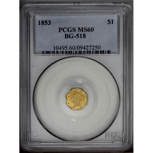 1853 $1 Liberty Octagonal 1 Dollar, BG-518, R.5, MS60