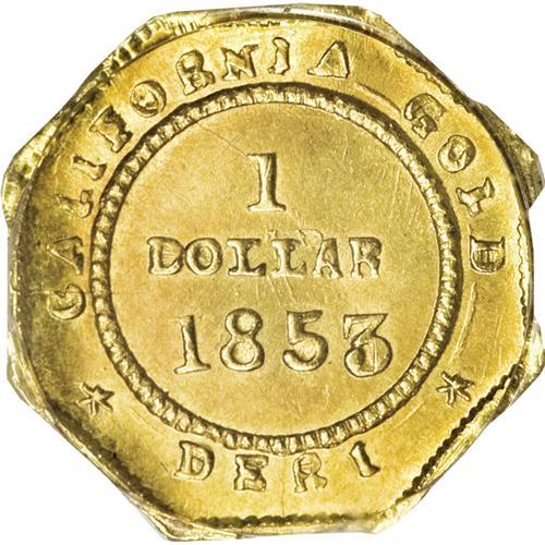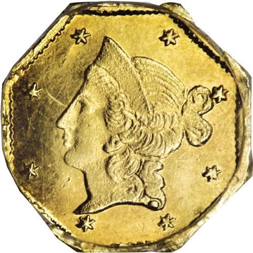 <B>1853 $1 Liberty Octagonal 1 Dollar, BG-518, R.5, MS62 PCGS.</B></I> Full dollar-sized California private gold issues from the original issuing period are among the most desirable pieces in the entire series. This example has brilliant green-gold color with faint traces of orange toning along the border. It is an exceptional example.<BR><BR><b>Shipping:</b> Coins & Currency (<a target="_blank" href="http://www.heritageauctions.com/common/shipping.php">view shipping information</a>)