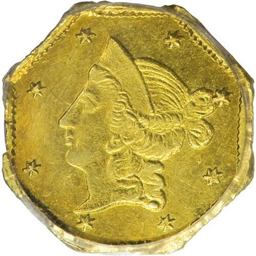 <B>1853 $1 Liberty Octagonal 1 Dollar, BG-518, R.5, MS62 PCGS.</B></I> Full dollar-sized California private gold issues from the original issuing period are among the most desirable pieces in the entire series. This example has brilliant green-gold color with faint traces of orange toning along the border. It is an exceptional example.<BR><BR><b>Shipping:</b> Coins & Currency (<a target="_blank" href="http://www.heritageauctions.com/common/shipping.php">view shipping information</a>)