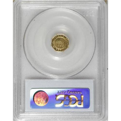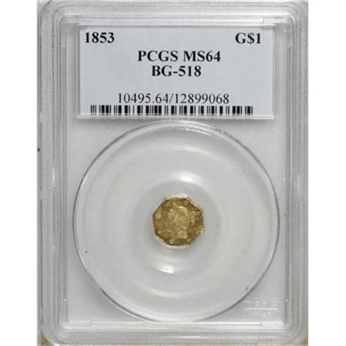 <B>1853 $1 Liberty Octagonal 1 Dollar, BG-518, R.5, MS64 PCGS.</B></I> This fractional gold dollar shows large stars on the obverse and the 3 in the date relatively low compared to 185 on the reverse. This example displays satiny green-gold surfaces that are free of abrasions. Slightly wavy, as made, with several die cracks noted on the reverse and one on the lower left obverse from the tip of Liberty's bust to the rim. Population: 3 in 64, 0 finer (3/08). <BR><BR><b>Shipping:</b> Coins & Currency (<a target="_blank" href="http://www.heritageauctions.com/common/shipping.php">view shipping information</a>)