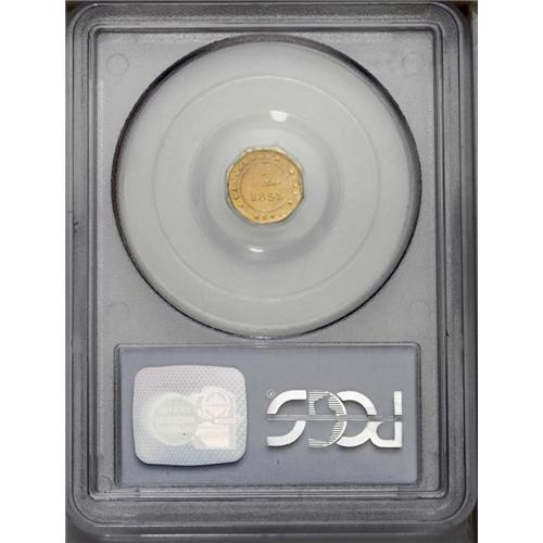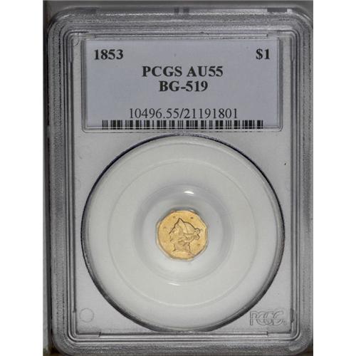 <B>1853 $1 Liberty Octagonal 1 Dollar, BG-519, Low R.4, AU55 PCGS.</B></I> Honey-gold color with subtle reddish undertones and a hint of remaining luster. A little softly struck on the reverse, with a small planchet flaw at about 5 o'clock. Overall a pleasing example with just light even circulation.<BR><BR><b>Shipping:</b> Coin/Currency (<a target="_blank" href="http://www.heritageauctions.com/common/shipping.php">view shipping information</a>)