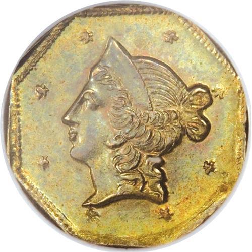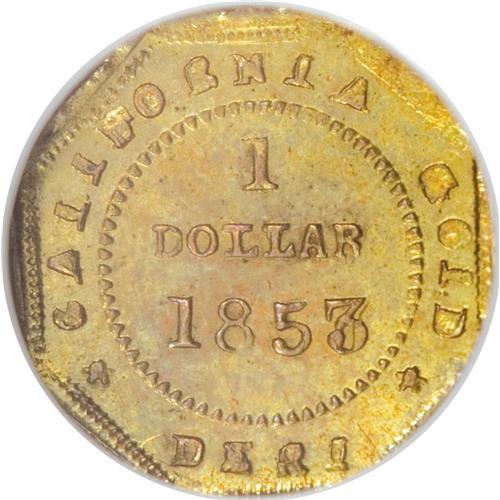 <B>1853 $1 Liberty Octagonal 1 Dollar, BG-519, Low R.4, MS65 NGC.</B></I> This lovely Gem features golden-brown borders and sea-green centers, with dashes of peach patina on the central reverse. This is the single finest NGC-certified BG-519 (as of 4/07), with second place shared by two MS63 pieces. PCGS has certified two examples as MS65.<BR><I>From The Diamond K Collection of California Fractional Gold.</B></I><BR><BR><b>Shipping:</b> Coins & Currency (<a target="_blank" href="http://www.heritageauctions.com/common/shipping.php">view shipping information</a>)