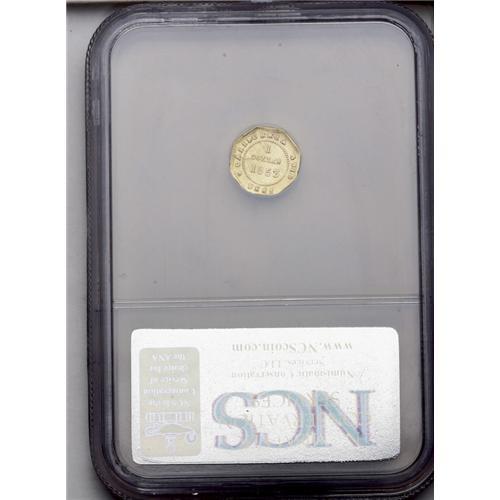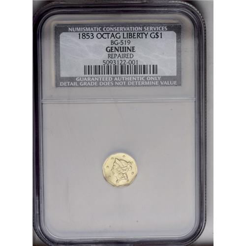 <B>1853<$1> Liberty Octagonal 1 Dollar, BG-519, Low R.4--Repaired--NCS (Unc. Details).</B></I> A repair on the reverse border near 4 o'clock has removed a star that belongs there, and the somewhat wavy piece has an unnatural matte appearance, perhaps from plating.