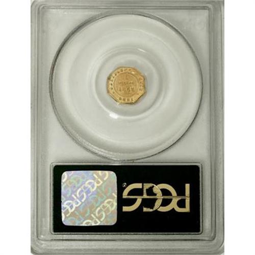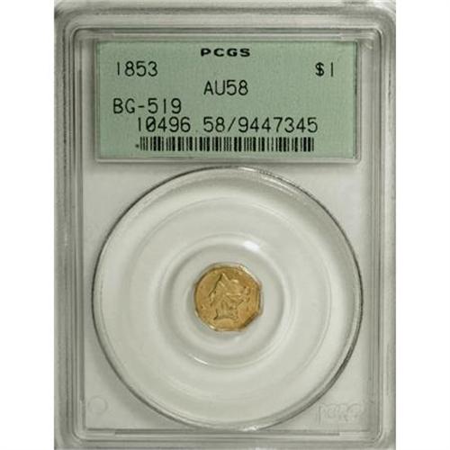 <B>1853 $1 Liberty Octagonal 1 Dollar, BG-519, Low R.4, AU58 PCGS.</B></I> This apricot-gold representative features boldly struck centers and unblemished fields. The left reverse border retains a few encapsulated green fibers. Housed in an old green label holder. Population: 25 in 58, 47 finer (8/07).<BR><BR><b>Shipping:</b> Coins & Currency (<a target="_blank" href="http://www.heritageauctions.com/common/shipping.php">view shipping information</a>)