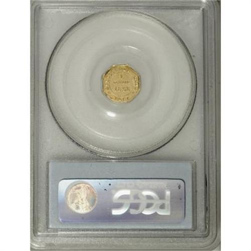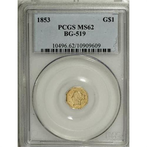 <B>1853 $1 Liberty Octagonal 1 Dollar, BG-519, Low R.4, MS62 PCGS.</B></I> A gleaming yellow-gold representative of this octagonal fractional issue, well-defined with a measure of reflectivity. Faint, scattered marks in the fields and on the devices preclude a Select or better grade. Population: 24 in 62, 11 finer (8/07).<BR><BR><b>Shipping:</b> Coins & Currency (<a target="_blank" href="http://www.heritageauctions.com/common/shipping.php">view shipping information</a>)