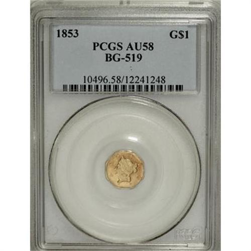 <B>1853 $1 Liberty Octagonal 1 Dollar, BG-519, Low R.4, AU58 PCGS.</B></I> This Deriberpie gold dollar perhaps spent an afternoon in the pocket of a gold rush merchant or miner before it was permanently set aside. The satiny surfaces have medium rose-apricot toning and lack noticeable marks.<BR><BR><b>Shipping:</b> Coins & Currency (<a target="_blank" href="http://www.heritageauctions.com/common/shipping.php">view shipping information</a>)