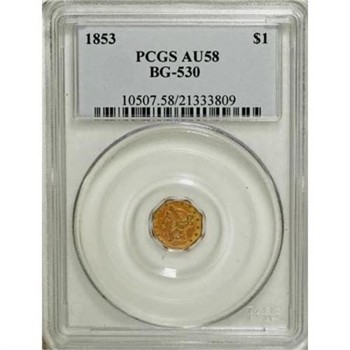 <B>1853 $1 Liberty Octagonal 1 Dollar, BG-530, R.2, AU58 PCGS.</B></I> PCGS Population (101/88). NGC Census: (11/31). (#10507)<BR><BR><b>Shipping:</b> Coins & Currency (<a target="_blank" href="http://www.heritageauctions.com/common/shipping.php">view shipping information</a>)