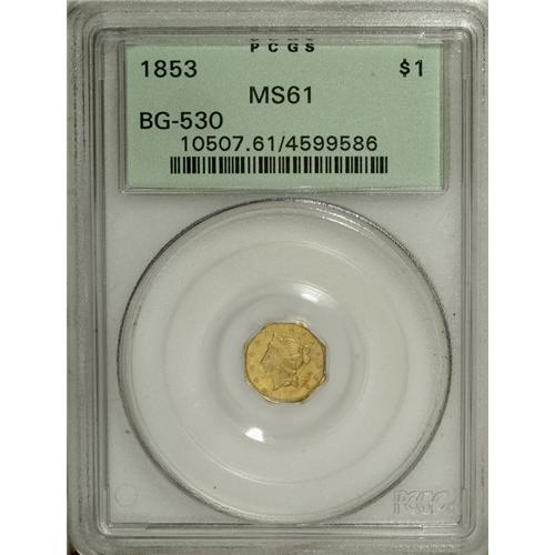 <B>1853 $1 Liberty Octagonal 1 Dollar, BG-530, R.2, MS61 PCGS.</B></I> This evenly struck yellow-gold representative has satin luster and a couple of faint, thin marks on the left obverse field. Housed in a green label holder.<BR><BR><b>Shipping:</b> Coins & Currency (<a target="_blank" href="http://www.heritageauctions.com/common/shipping.php">view shipping information</a>)