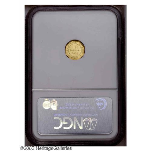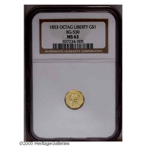 <B>1853<$1> Liberty Octagonal 1 Dollar, BG-530, R.2, MS62 NGC.</B></I> A bold and bright straw-gold example of this popular Period One variety. The obverse is nearly unabraded, while a few minor marks are seen on the reverse.